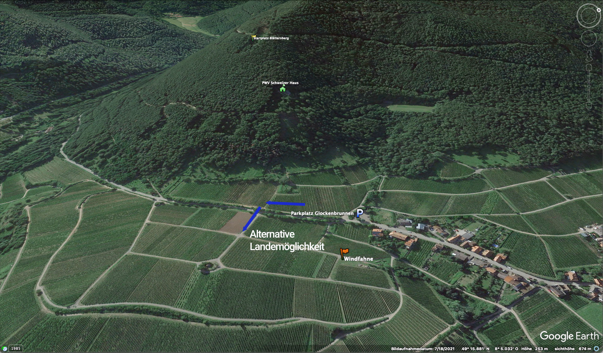 Der offizielle Landeplatz (siehe Übersichtskarte) ist klein und schwierig anzufliegen. Oft weiden dort auch Pferde, dann ist keine Landung möglich! Die Wiesen nebenan bei der Burrweiler Mühle sind von Stromleitungen überzogen und auch hier weiden Pferde. Es gibt aber eine relativ gute Alternative: einen Weg im Weinberg. Mit guter Konzentration, Peilung und Landetechnik kommst du hier am einfachsten und am sichersten wieder auf den Boden. Achtung: auf dem Weg sind auch Spaziergänger und Traktoren unterwegs! Lass dir die Landung dort gut erklären. Mit den richtigen Tipps ist diese Altenative wirklich gut!