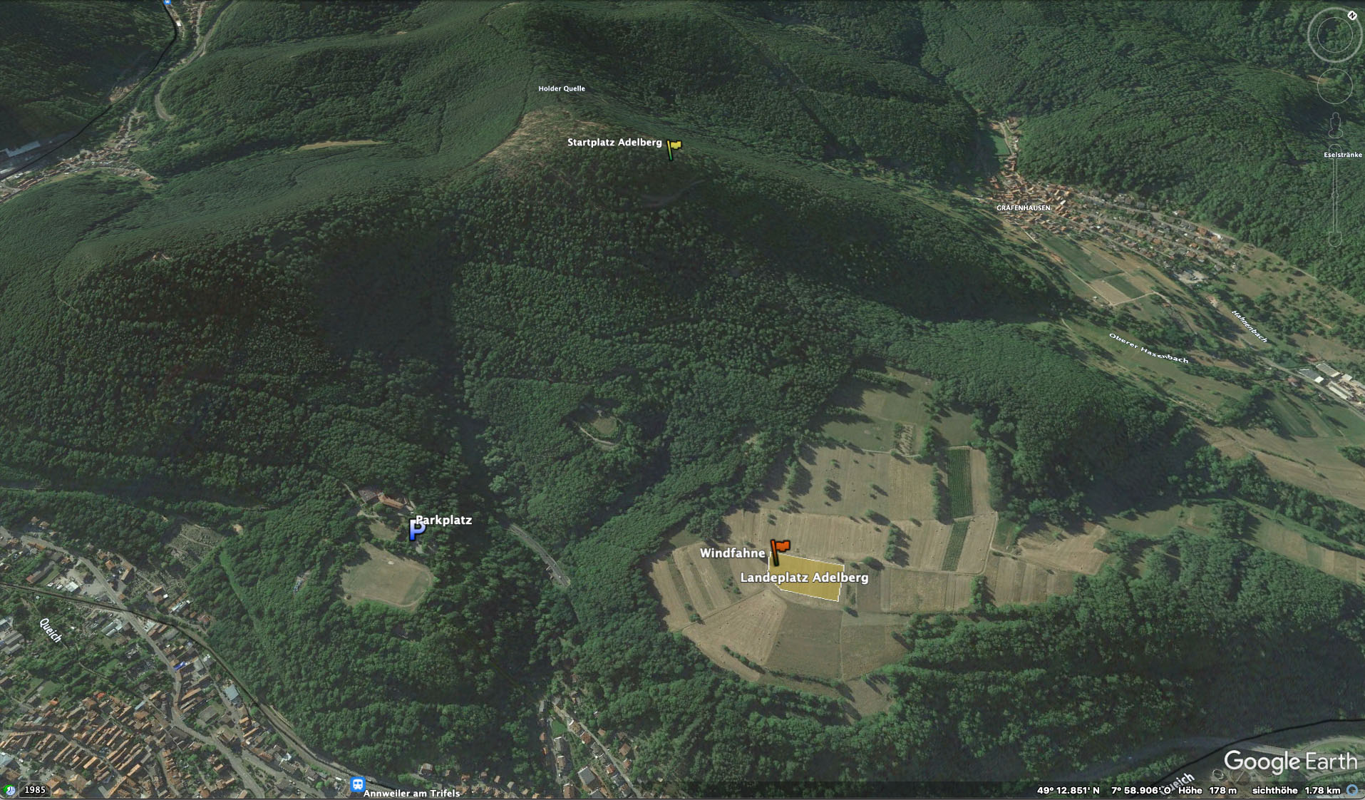 - Landeplatz: 49° 12’ 54,46“ N ; 7° 58’ 06,21“ O ; Höhe ca. 330 m