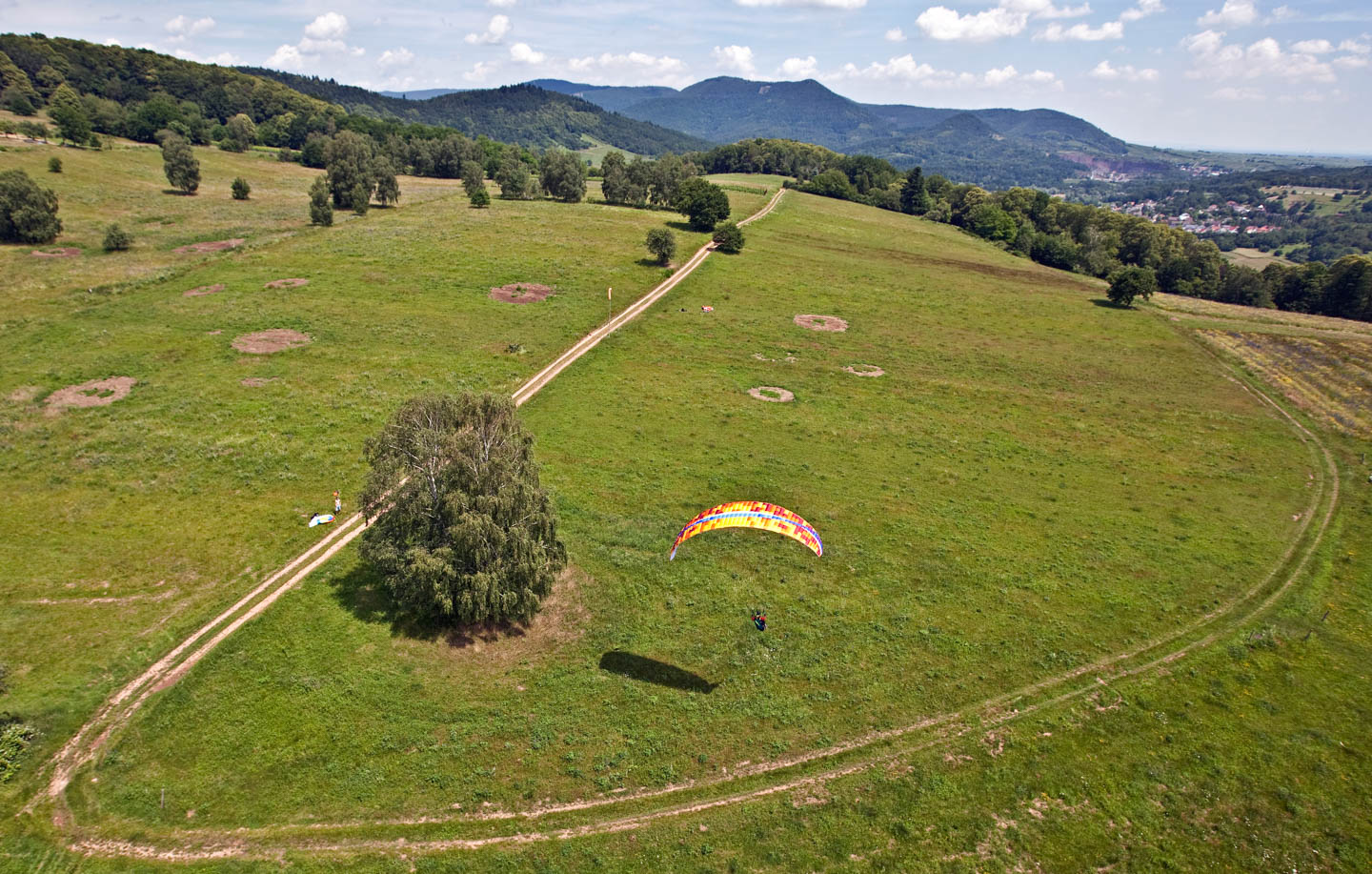 Unser bester Pfälzer Landeplatz ist hier! Die großzügige, hindernisfreie Wiese ist einfach anzufliegen und ermöglicht auch bei thermischen Verhältnissen eine sichere Landung. Bei Ostwind (in Flugrichtung vom Startplatz kommt dieser von links) fliegen wir die Linksvolte, die Position ist bergseitig der Landewiese. Bei Süd oder West am Landeplatz (Vorsicht, das sind dann thermische Ablösungen!) ist die Rechtsvolte angesagt.